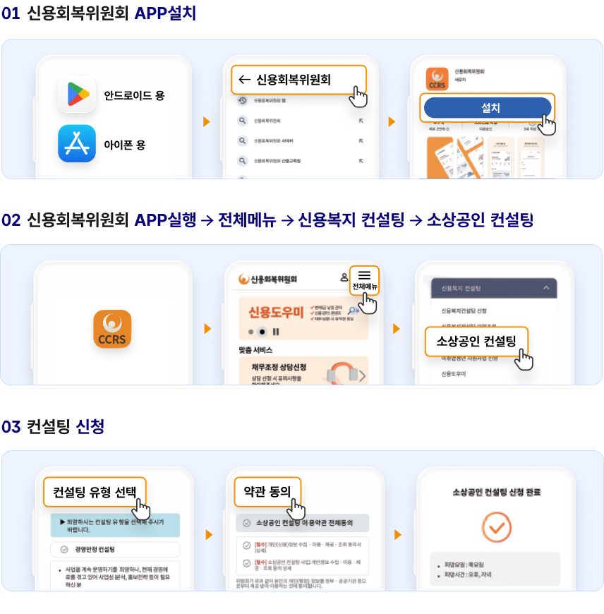 - 신용회복위원회 APP실행 → 전체메뉴 → 신용복지 컨설팅 → 소상공인 컨설팅
